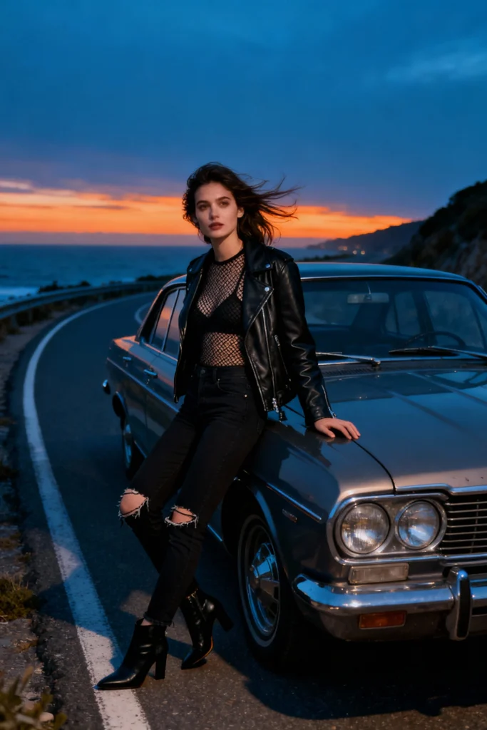 This outfit leans into texture and attitude. Mesh, leather, and denim combine to create a layered look that feels rebellious yet refined.