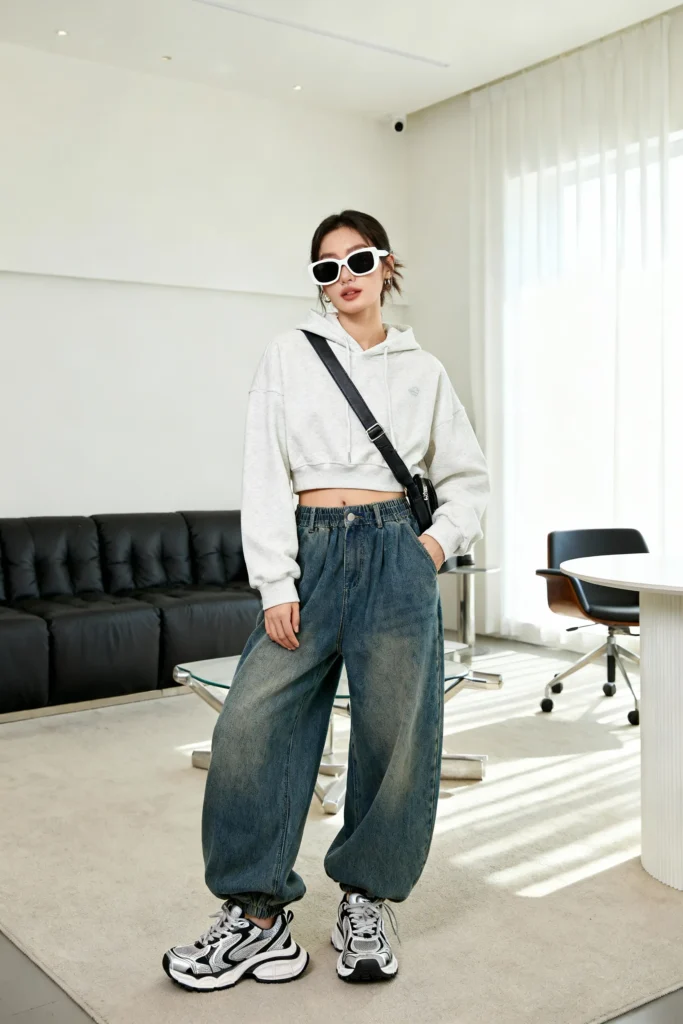 Why this works: balloon jeans already shout personality, so pairing them with sporty basics keeps the outfit grounded. Want to keep it luxe? Choose a hoodie in a premium fabric and add metal hardware accessories.