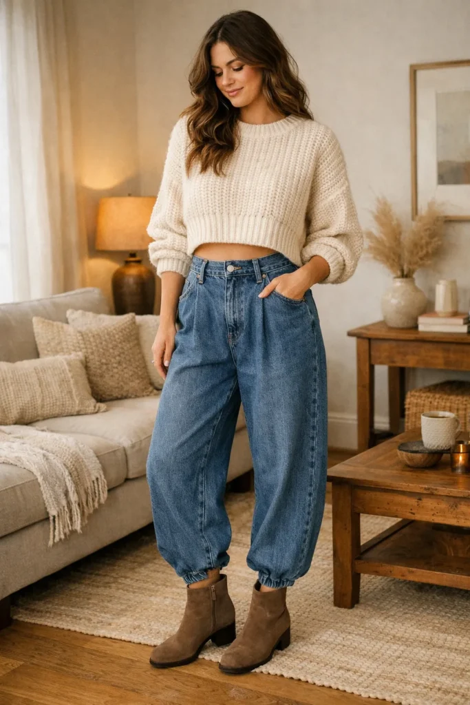 3 — Chunky Knit + Balloon Jeans (Cozy, Not Clumsy)