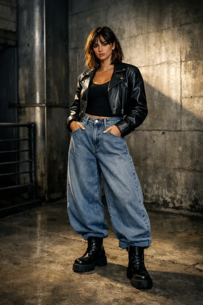 6 — Leather Jacket + Balloon Jeans (Edgy Balance)