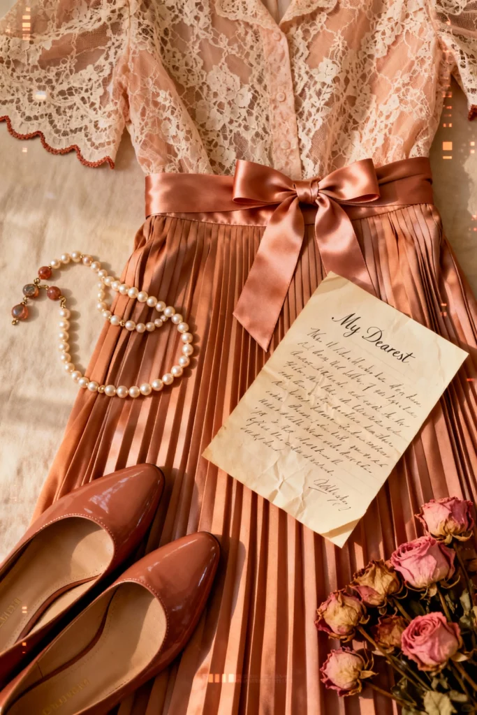 This look leans into memory and romance — handwritten notes, pearls, and timeless silhouettes. It’s cinematic without being costume-like.