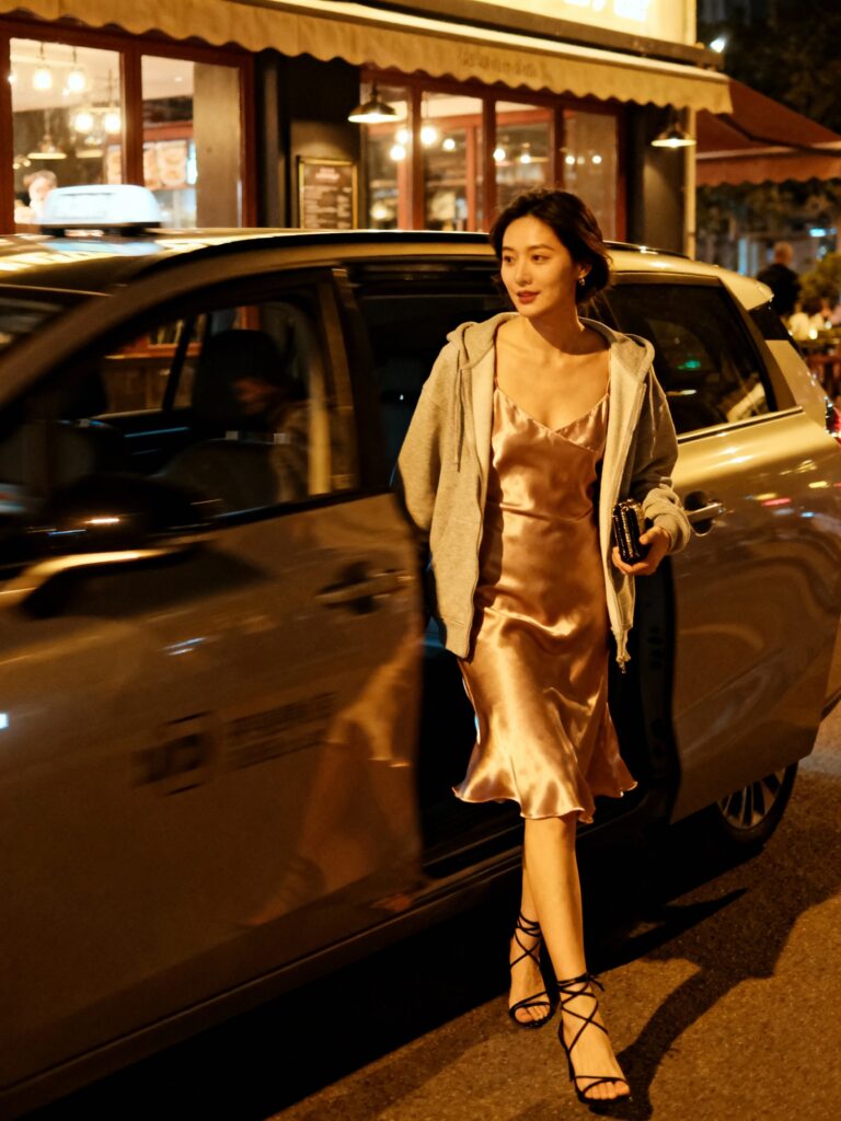 Yes, a hoodie can go out-out. Layer it with a slip dress and heels for a high-contrast look that’s equal parts sultry and cozy. It’s unexpected in the best way and photographs beautifully under city lights.