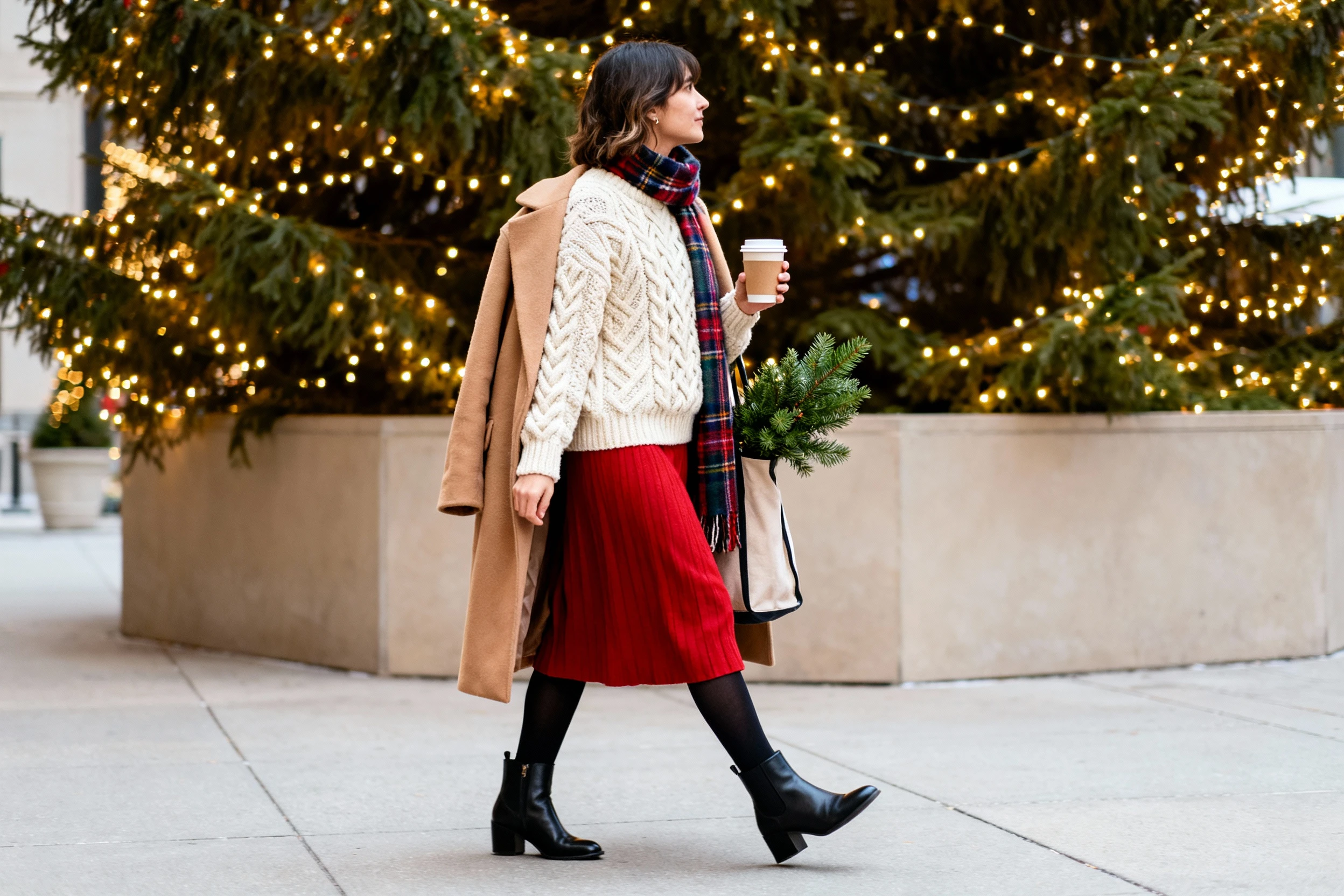 Shoot by the tree, the mantel, or an outdoor market. For an elevated twist, add subtle herringbone or micro-check patterns.
