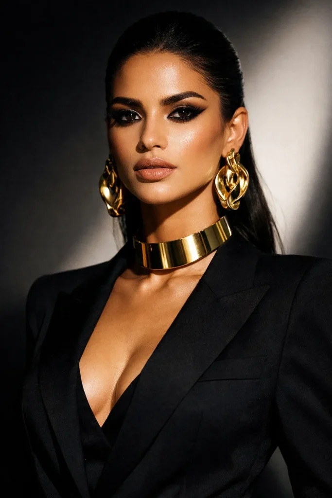 This look is all about confidence. Statement gold pieces paired with sleek outfits create a powerful, modern aesthetic that commands attention.