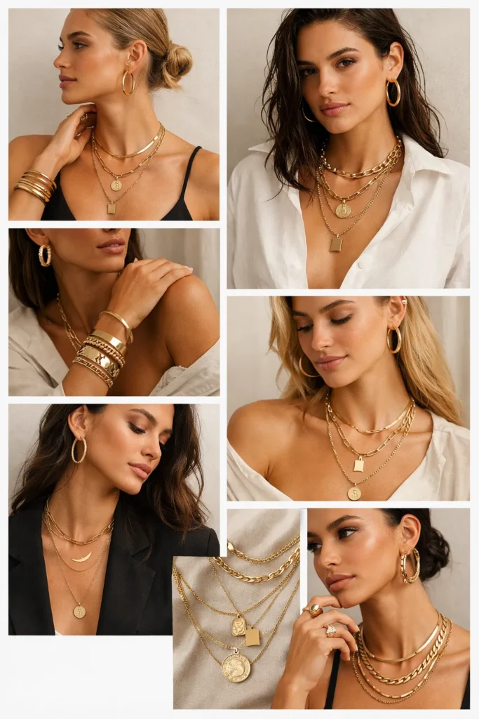 A collage approach shows how versatile gold jewelry can be across different outfits and personalities. It feels fresh, editorial, and inspiring.