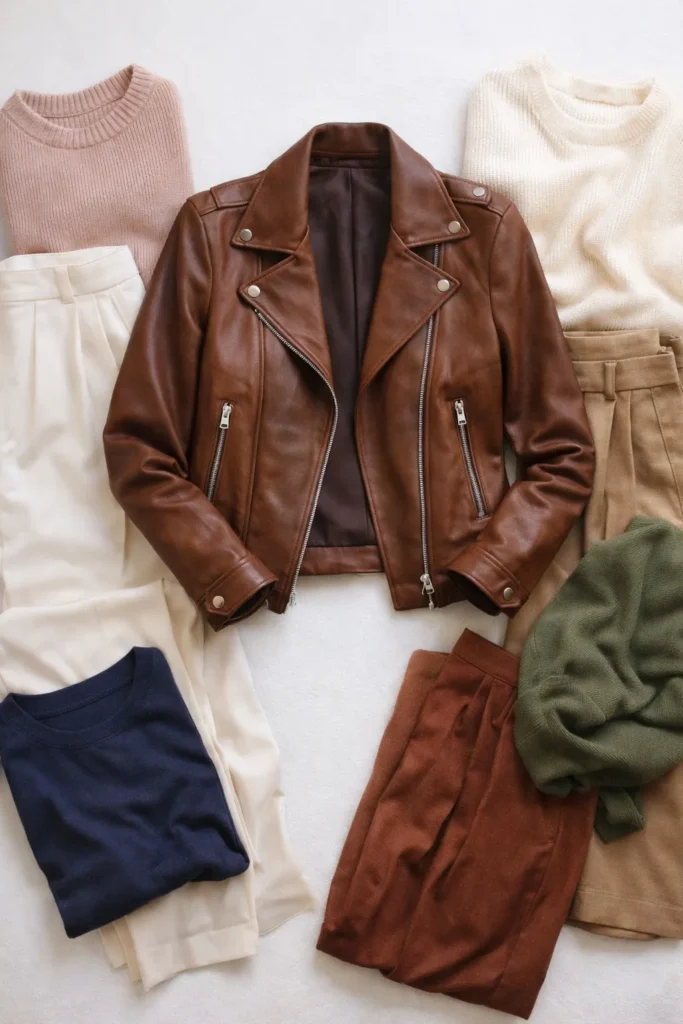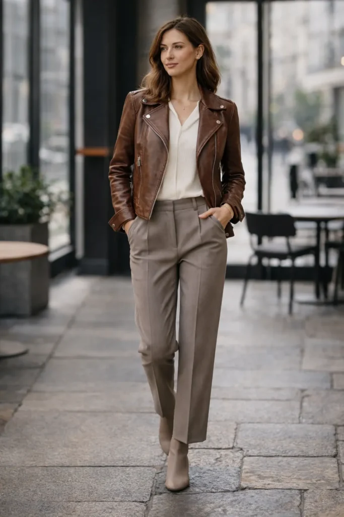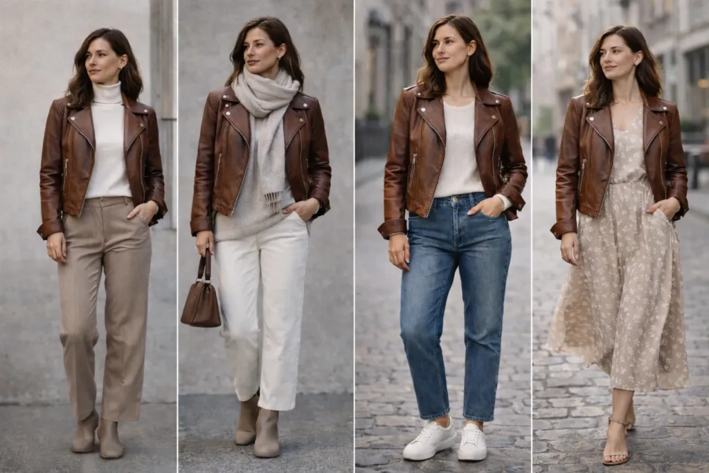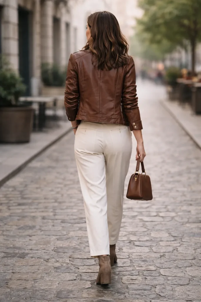 That’s why so many women think their brown leather jacket “doesn’t work anymore,” when the real problem is what they’re pairing it with.