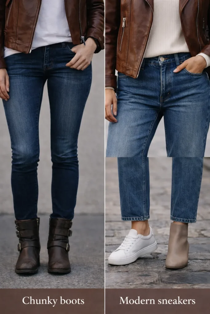 Chunky, overly distressed, or dated footwear ages the entire outfit. Clean sneakers, sleek boots, or loafers modernize instantly.