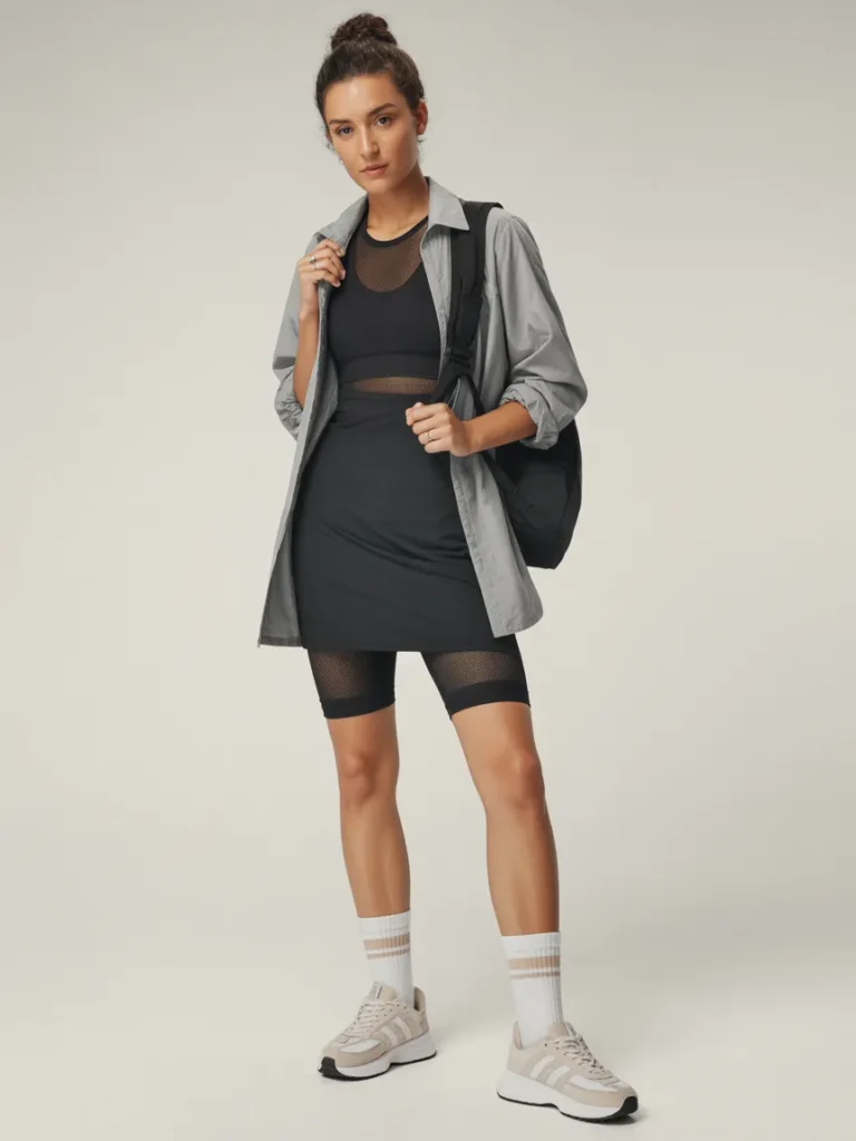Take a performance dress with mesh inserts and style it beyond the gym. An overshirt and chunky sneakers transform it into an off-duty statement. It’s functional, breathable, and looks way cooler than leggings again.