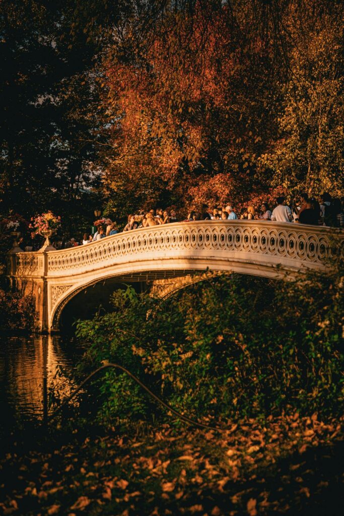 This spot is classic New York romance. The bridge’s elegant curves, the lake reflections, the skyline peeking through trees—it’s got layers.