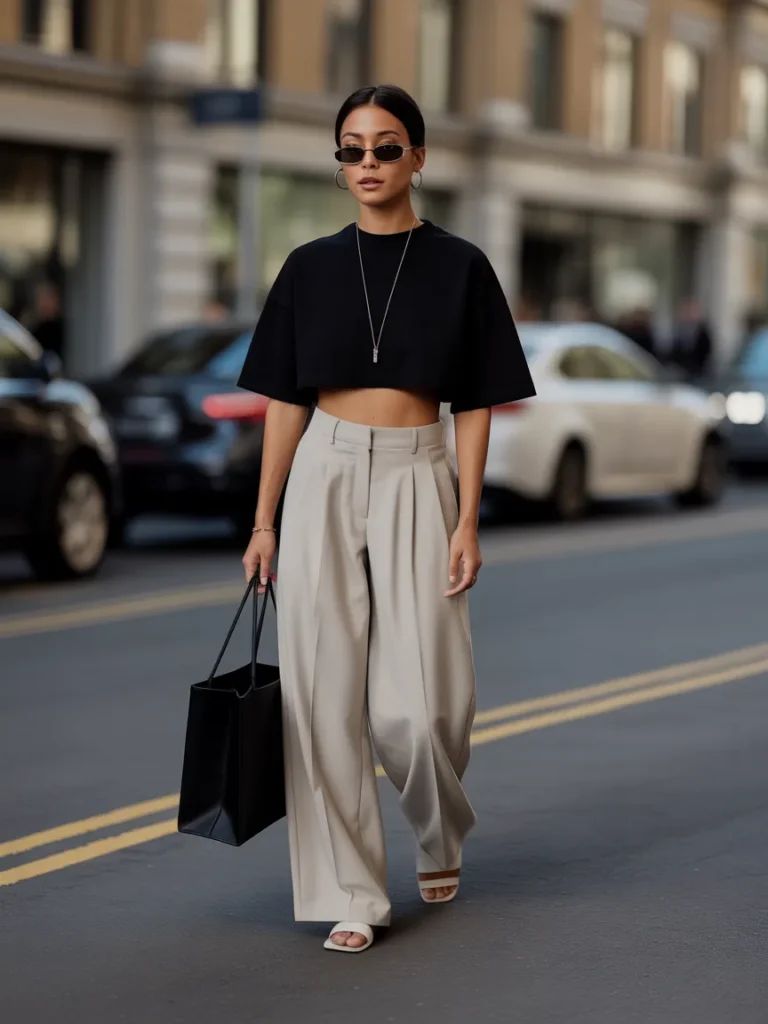 Play with proportions: slightly cropped crewneck, very wide pants, sleek accessories. It’s a super-modern silhouette that screams “effortless,” not “I tried for an hour.” The movement alone gets you compliments.