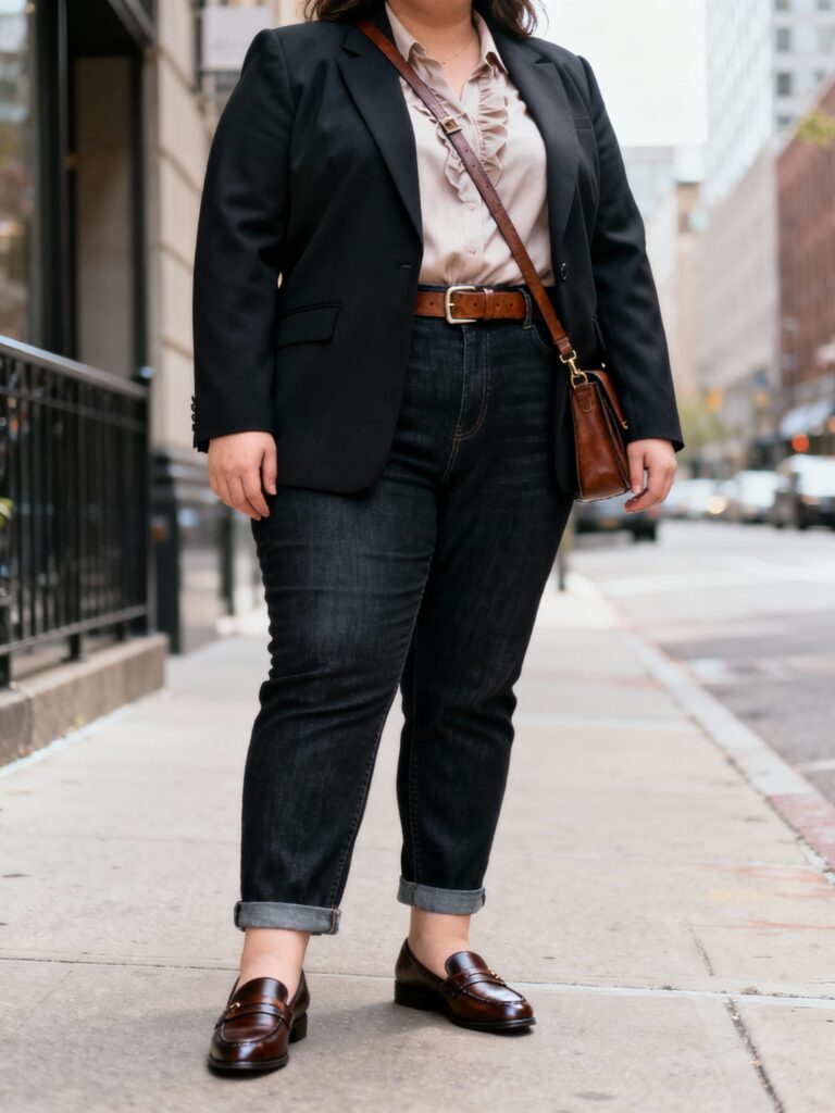 - Keep the blazer structured—this is what makes the look office-ready.