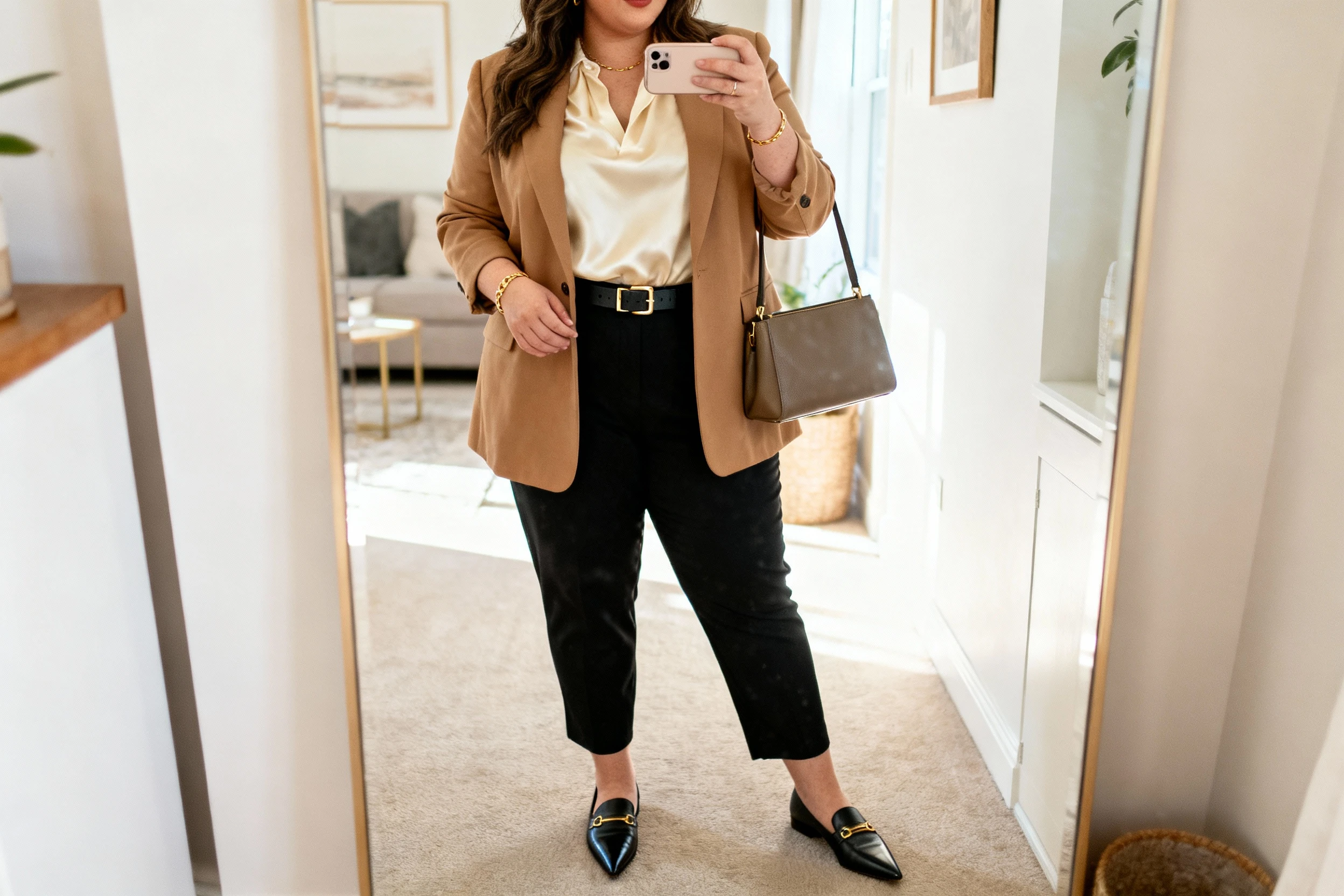 - Accessories: slim belt, simple jewelry, structured tote