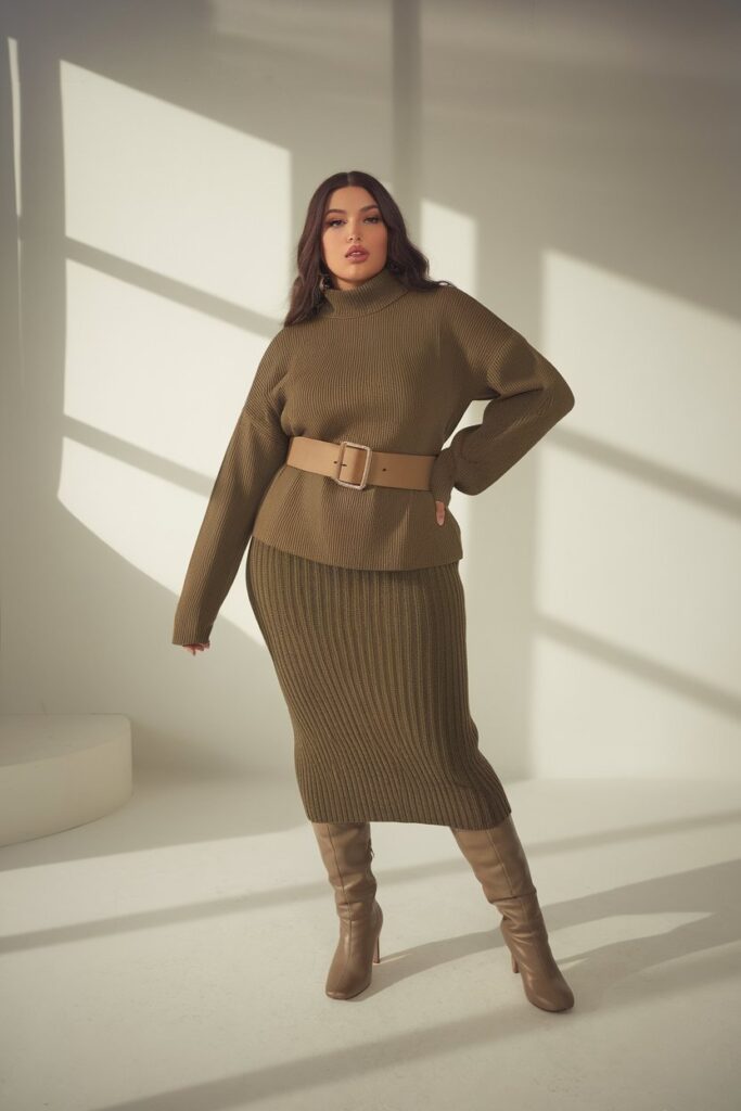 Winter can be feminine, structured, and cozy all at once—this outfit proves it. A fitted olive sweater cinched with a belt defines curves beautifully, while the ribbed midi skirt adds softness.
