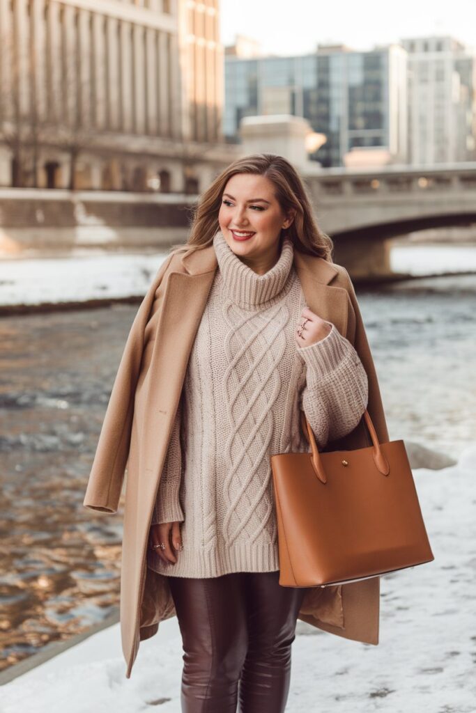 This look is part comfort, part sophistication. A cable-knit sweater layered under a camel coat hits that sweet spot between warm and polished.