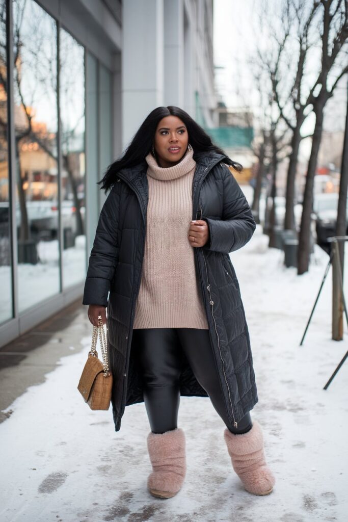 The long black puffer is the winter MVP. Paired with a cozy oatmeal sweater and leggings, it gives streetwear chic without trying too hard.