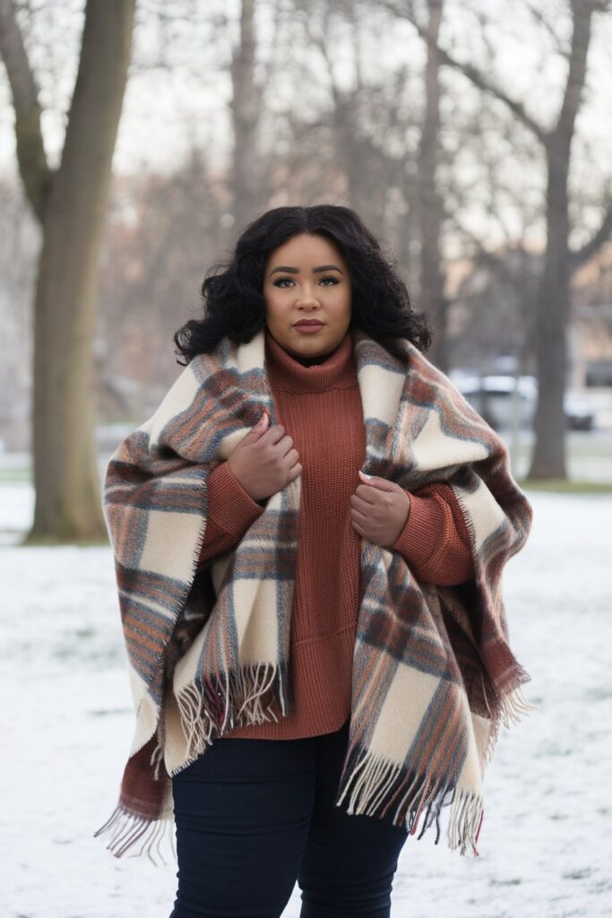 This is the ultimate cozy classic. A warm rust sweater paired with a plaid blanket scarf creates instant winter charm with zero effort.