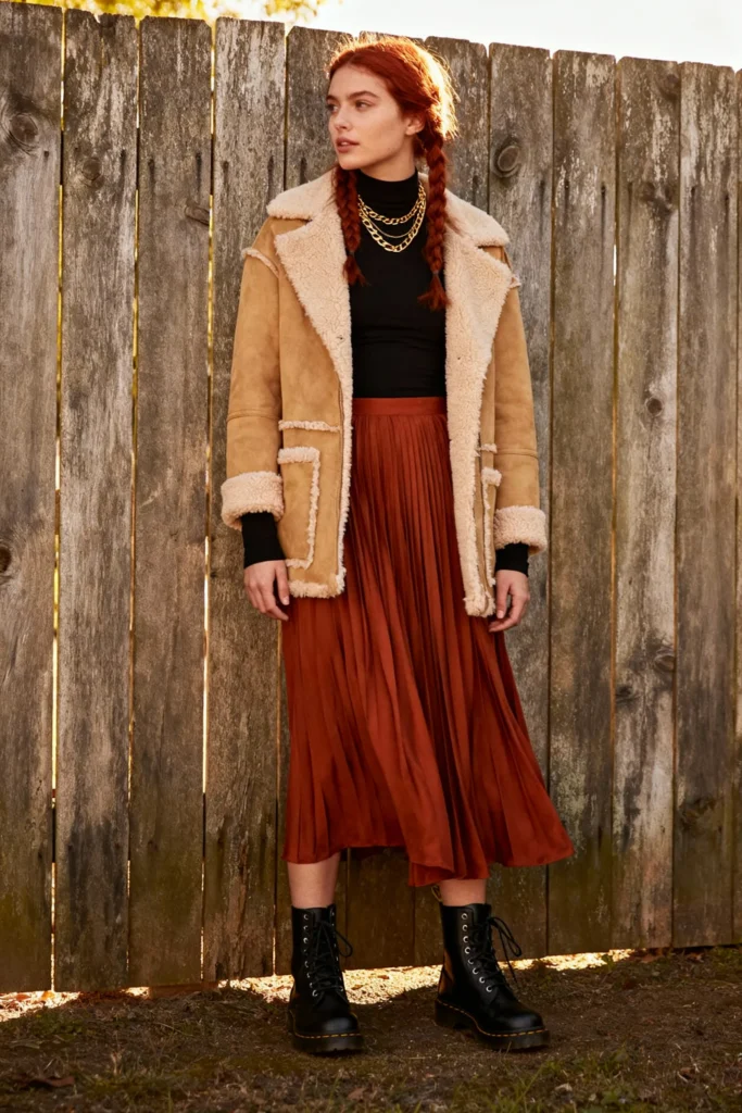 10: Shearling Coat + Midi Skirt + Combat Boots