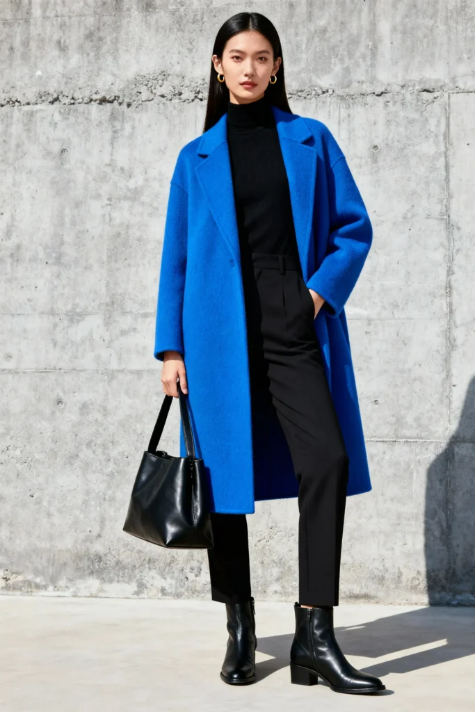 Pick a coat in a color that makes you feel alive—electric blue, cherry red, emerald green, whatever speaks to you. Then build the rest of your outfit in one neutral color. Black, white, gray, even navy—just keep it simple.