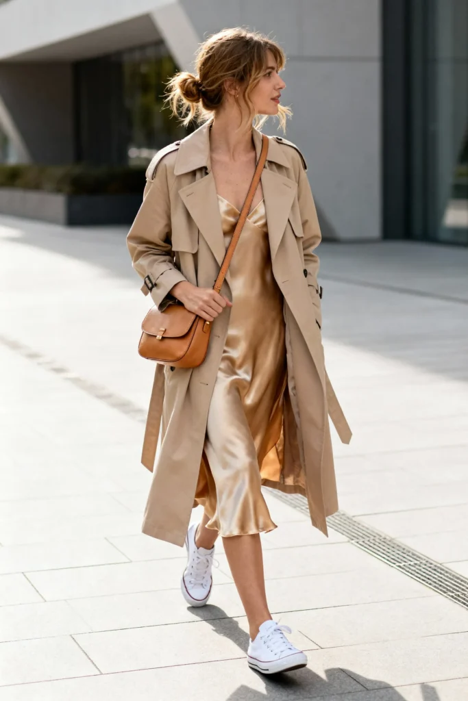 5: Trench Coat + Slip Dress + Sneakers