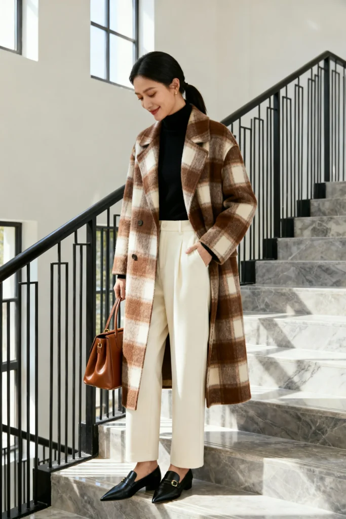 Plaid coats have this vintage charm that instantly makes you look more interesting. Pair it with a fitted turtleneck and wide-leg trousers, and you’ve got yourself an outfit that looks like you raided a very stylish grandmother’s closet—in the absolute best way.
