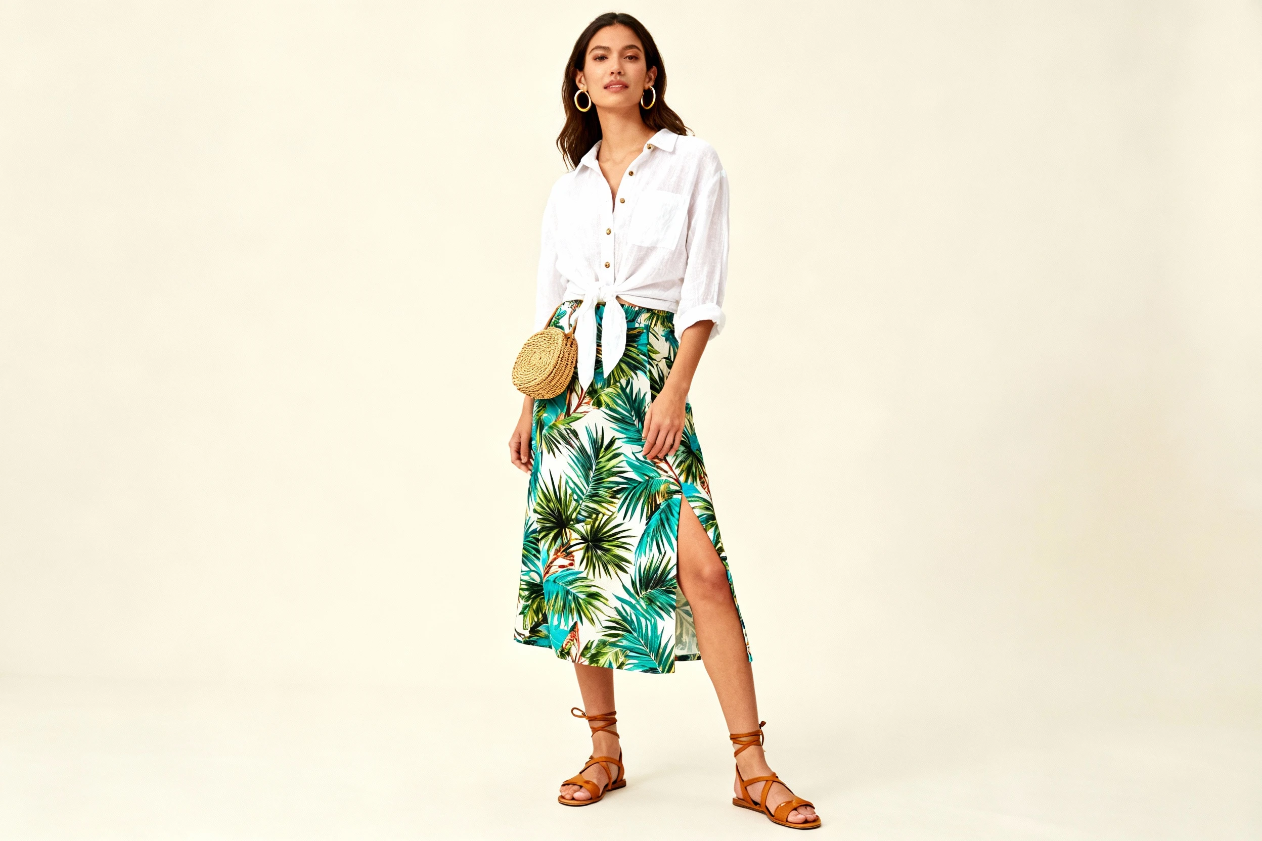 - Tropical print maxi skirt (palm, hibiscus, or abstract)
