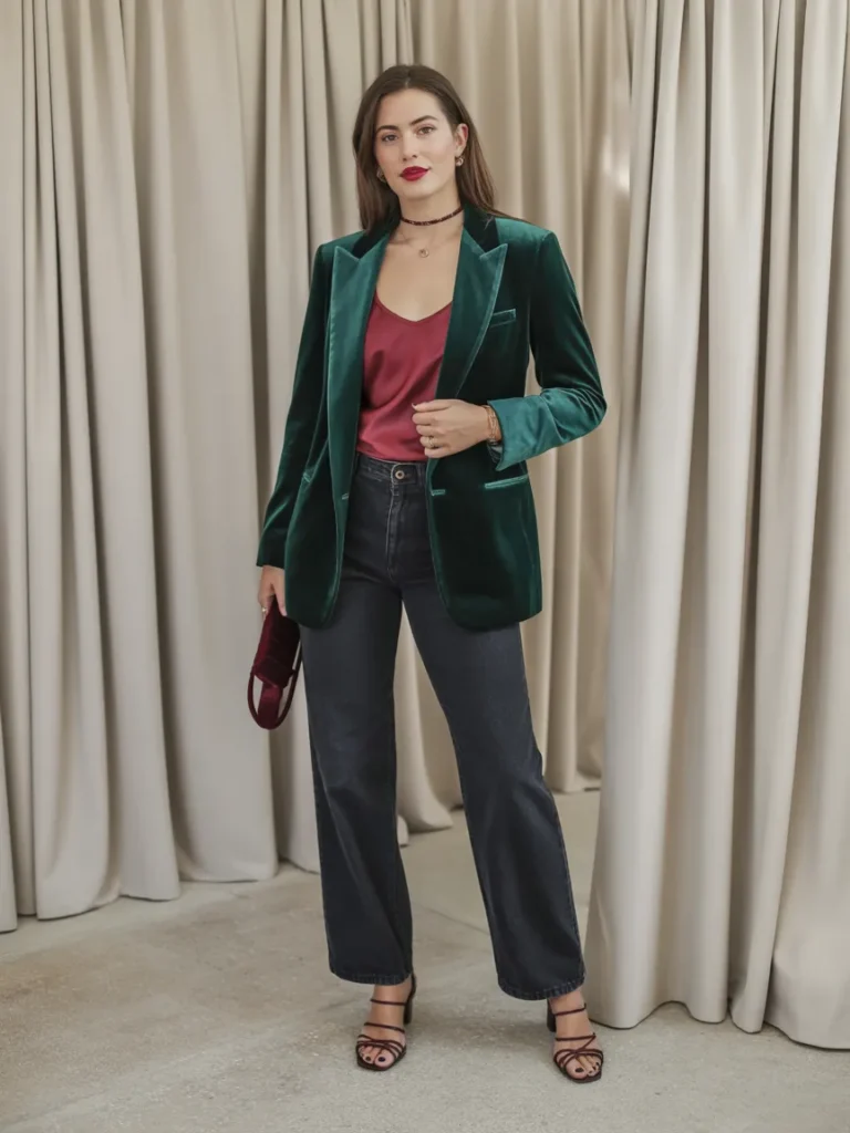 - Velvet blazer (emerald, ruby, or midnight blue)