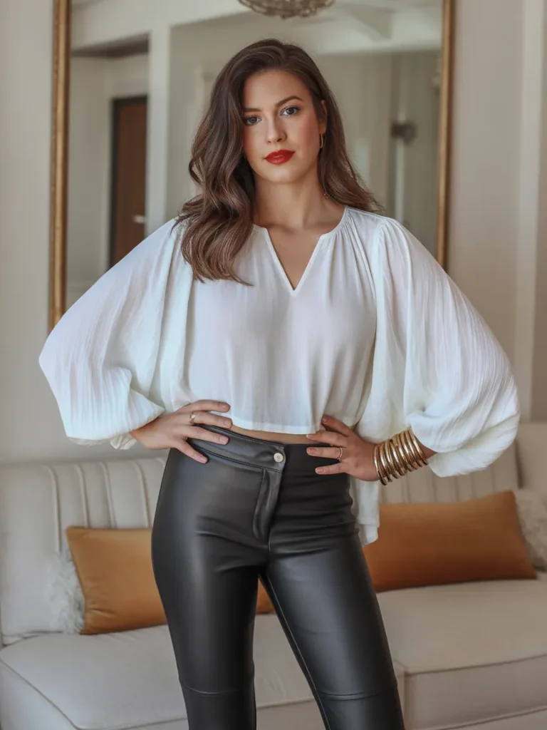Leather pants sound intimidating but actually make you look like you have your life together. Paired with a flowy top, they’re surprisingly forgiving (hello, dessert stomach).