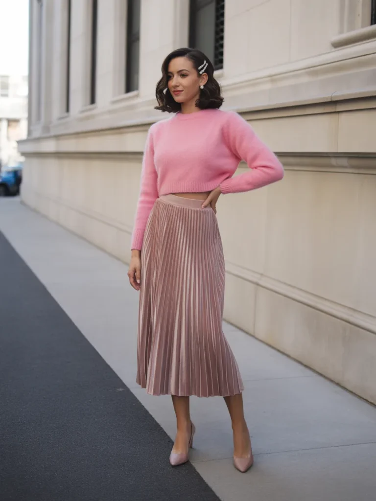 Match the sweater’s crop to the skirt’s waistband—no midriff gaps. Play with textures: fuzzy sweater + slick skirt = instant depth. Tuck one side of the sweater in for asymmetry. Bonus: This outfit photographs incredibly well.